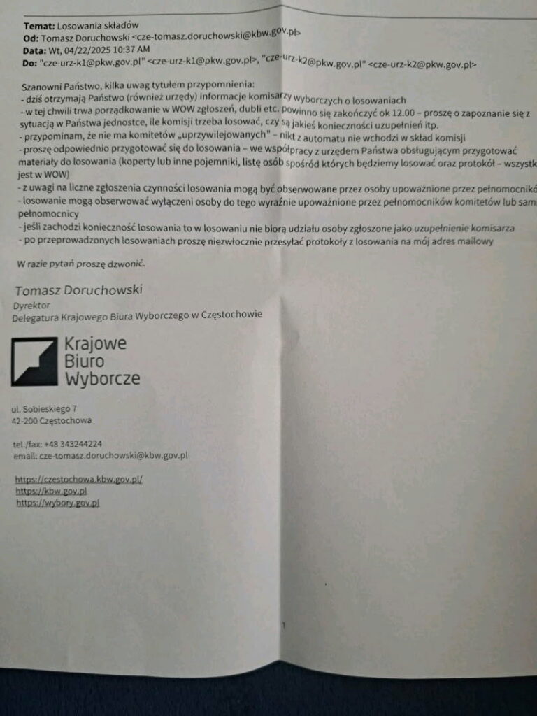 Art182 Kodeksu Wyborczego mówi o losowaniu publicznym składów Obwodowych Komisji Wyborczych, tymczasem na podstawie takiego maila/dokumentu rozsyłanego przez Krajowe Biuro Wyborcze urzędnicy nie dopuścili i nie dopuszczają kandydatów na członków OKW oraz obywateli do obserwacji losowań Obwodowych Komisji Wyborczych! To jawne gwałcenie Kodeksu Wyborczego ułatwiające przygotowanie składów OKW do sfałszowania wyborów.