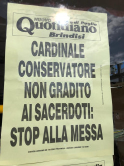 „Konserwatywny kardynał nie jest mile widziany wśród kapłanów” – podaje gazeta Quotidiano di Puglia. W leadzie artykułu czytamy; „Msza w Katedrze pod przewodnictwem amerykańskiego kardynała odwołana. Lokalny ksiądz wyraził zażenowanie jego [kardynała – red.] postawą przeciwną wobec papieża”.