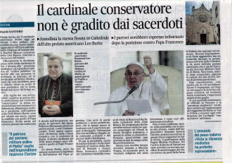 The latest Brindisian newspapers present us with a very disturbing sign concerning Cardinal Leo Burke, who was politely shown the door in that sordid and humiliating way only the prevailing clericalism is capable of. “The conservative Cardinal is not welcomed by the priests”, were yesterday’s headlines in the Quotidiano di Puglia: Annulled the American high-prelate’s Mass scheduled in the Cathedral. The parish-priests had expressed embarrassment after his position against Pope Francis.